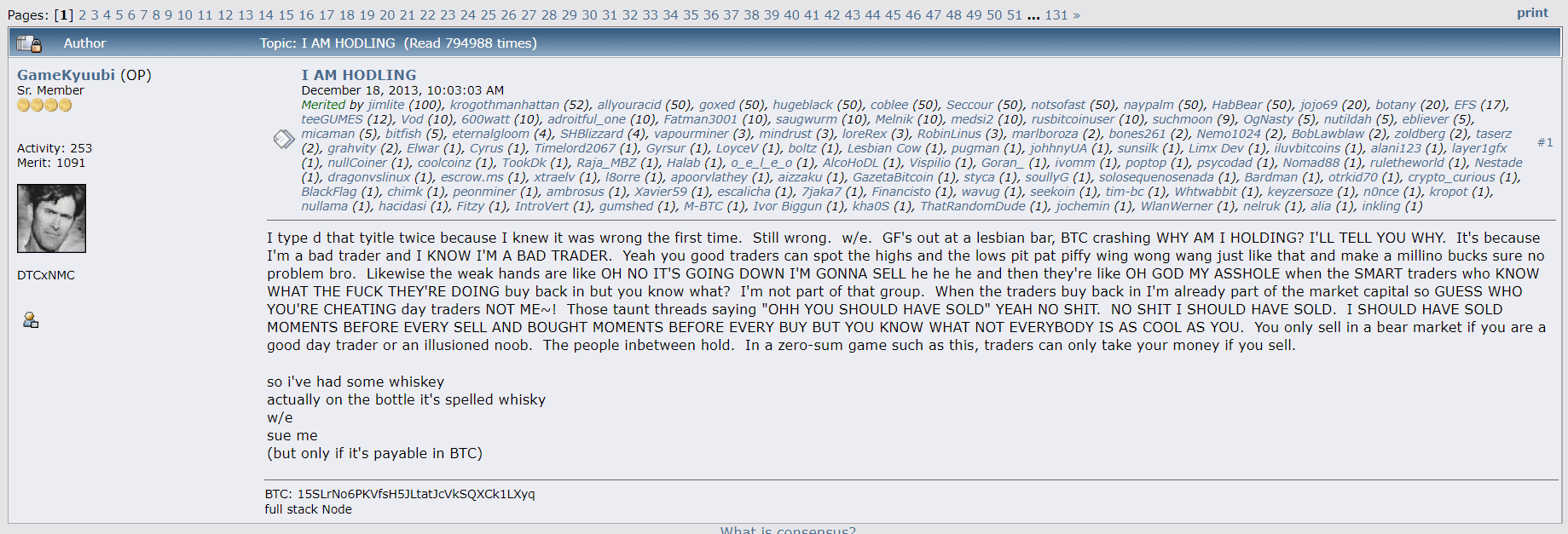 Téma diskuze proto nazval “I AM HODLING,” posilněn alkoholem však místo slova “HOLDING” (česky držet) napsal “HODLING”.