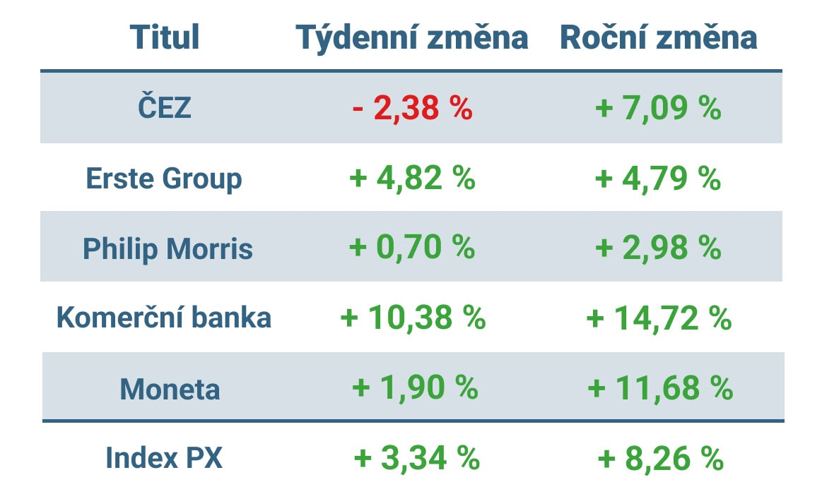 Komerční banka zaznamenala týdenní nárůst o více než 10 % na 977 Kč. Dařilo se také Erste Group, jejíž akcie vzrostly o téměř 5 %, a také akciím Moneta s růstem o necelá 2 %.