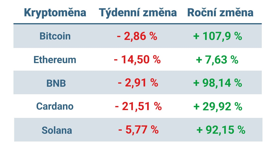 Bitcoin se kolem nedělní 11. hodiny obchoduje lehce pod úrovní 97 tisíc dolarů, což znamená týdenní ztrátu cca 3 %. Téměř 15 % pak ztratilo v týdenním srovnání Ethereum a dokonce přes 20 % Cardano.