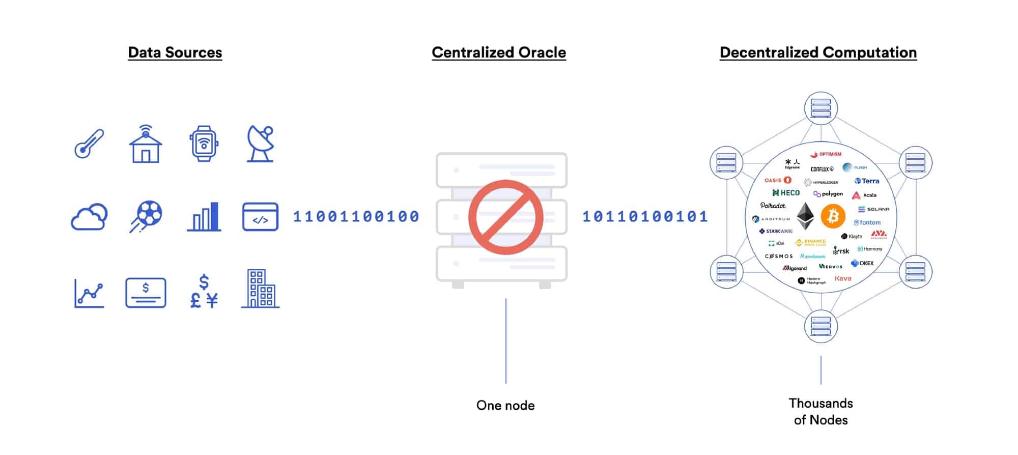 Naproti tomu decentralizované oracles pracují s více uzly a více zdroji dat. Chytré smlouvy mohou zároveň využívat více různých oracles, aby získaly ještě přesnější a spolehlivější data.