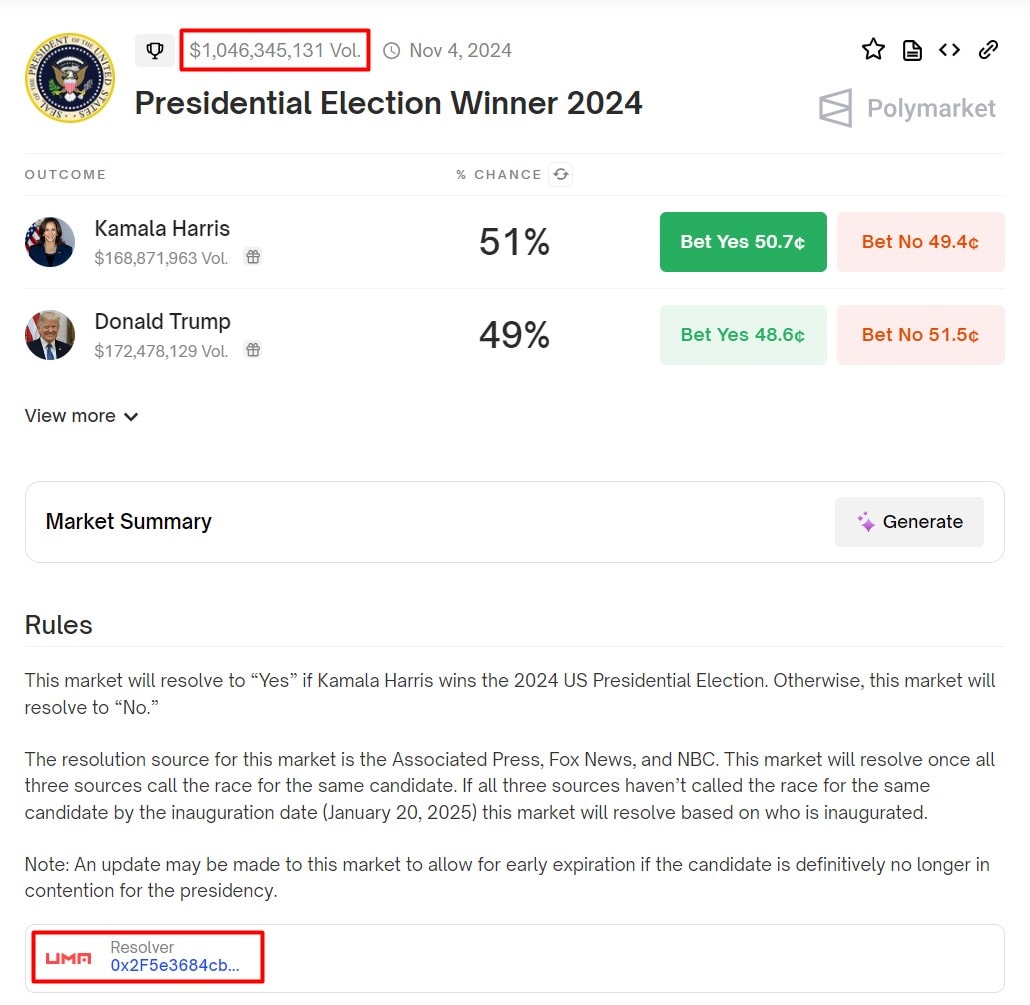 Ani největší tržiště sázek, Polymarket, na kterém bylo mj. před prezidentskými volbami v USA vsazeno na vítězství či prohru kandidátů dohromady přes 1 mld. USD, se neobejde bez oraclu. Data z reálného světa pro něj zajišťuje Uma (UMA).