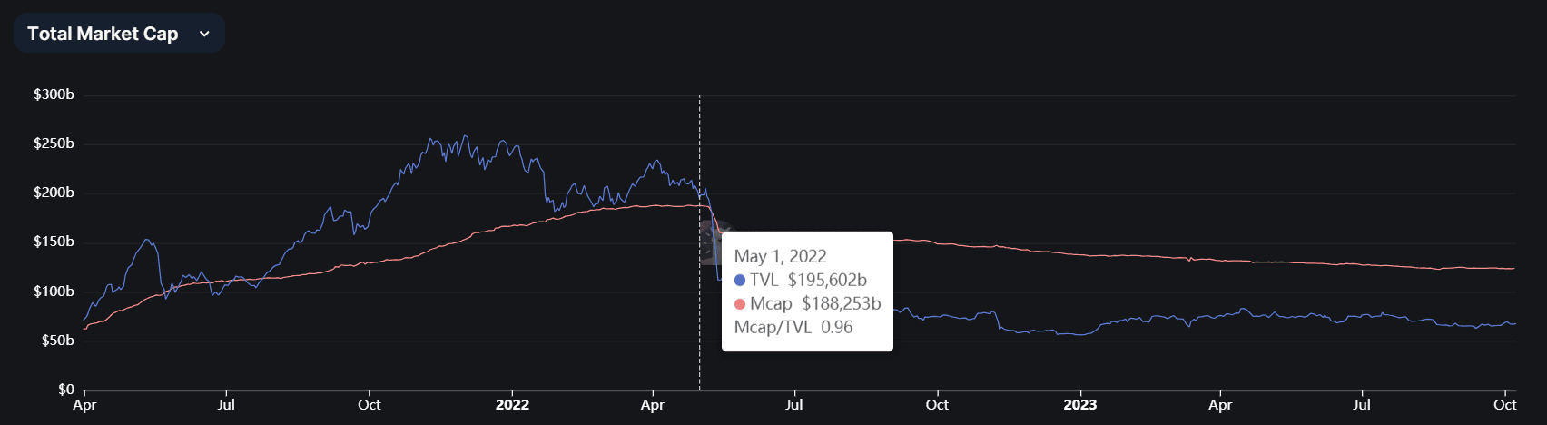 Celková tržní kapitalizace stablecoinů konstantně klesá již od května 2022, kdy došlo ke krachu ekosystému Terra, což mnozí považují za událost ohraničující konec bull marketu a začátek bear marketu. Krach způsobila ztráta vázanosti (tzv. depeg) stablecoinu UST na dolar. Po tom, co stablecoiny UST, kterých bylo v době krachu vydáno téměř 19 miliard, ztratily hodnotu, se důvěra uživatelů ve stablecoiny, zejména ty algoritmické a nekryté v poměru 1:1, značně snížila.