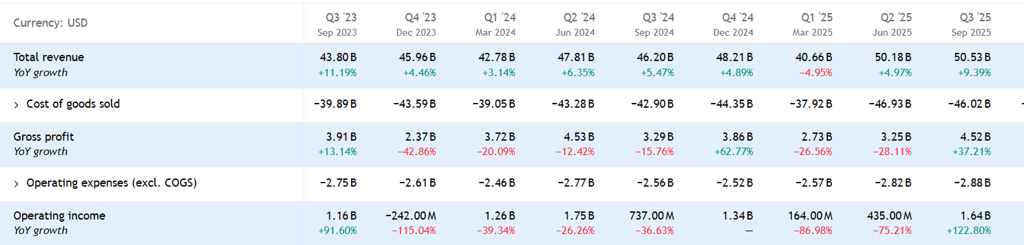 Tržby dosáhly přibližně 50,5 miliardy dolarů, což znamenalo meziroční růst kolem 9 % oproti stejnému období roku 2024.