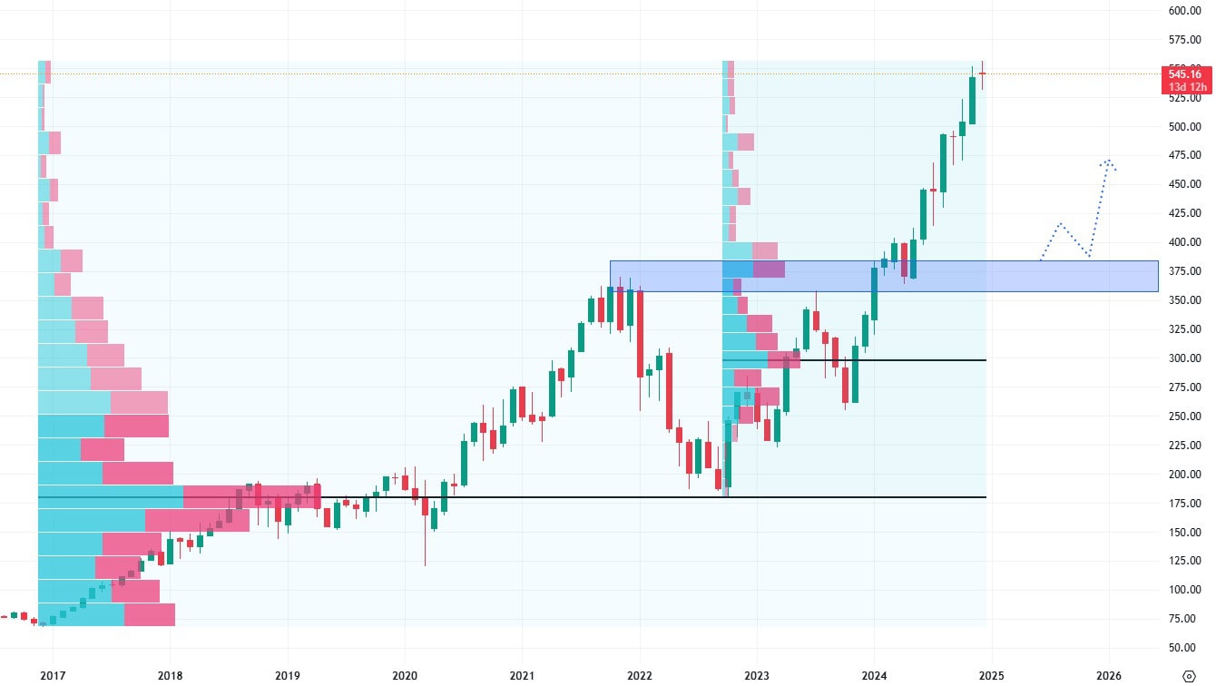 Akcie Intuitive Surgical se obchodují v up trendu, bez výraznějších cenových korekcí. Nejbližší support se nachází až na ceně 375 USD za akcii a jedná se o hranu volume profilu a také proražené předchozí cenové maximum.
