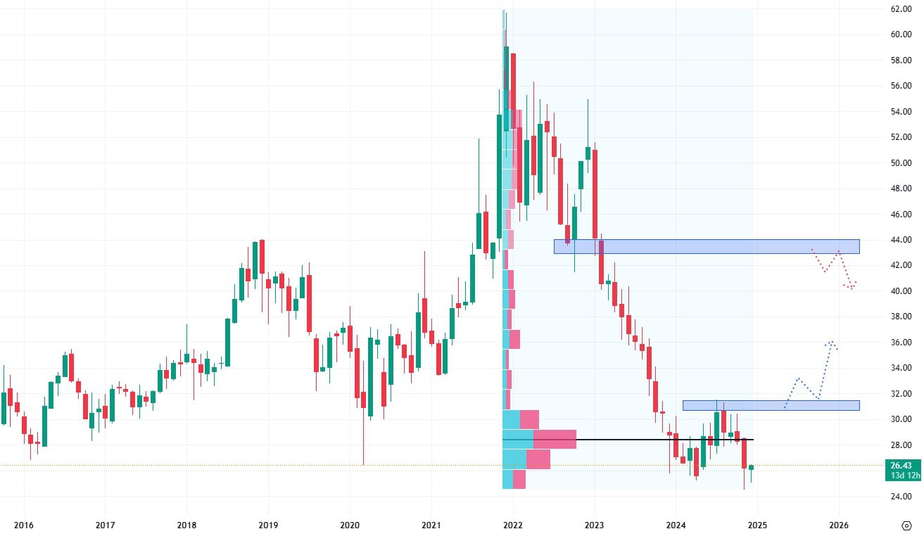 Podle pozitivní cenové predikce by mělo v následujícím roce dojít k průrazu této rezistence, díky čemuž by se vytvořil důležitý support, který by mohl trh v případě korekce podpořit v růstu. Do té doby se akcie budou obchodovat v klesajícím trendu.