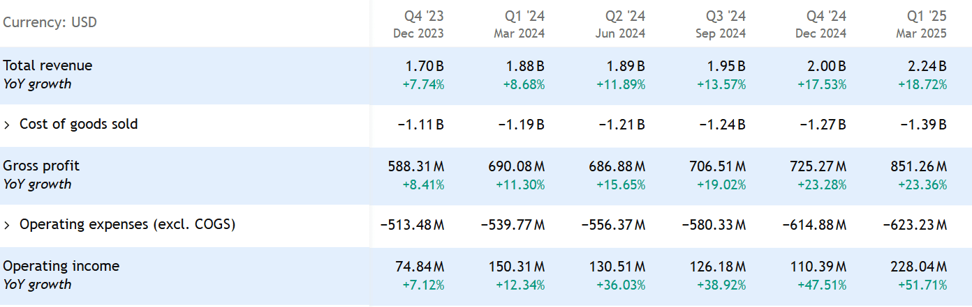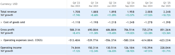 Síla společnosti se projevuje v růstu tržeb, který dosahuje dvouciferných hodnot. Za 1Q 2025 tržby rostly o 18,7 % a dosáhly 2,24 miliardy USD.