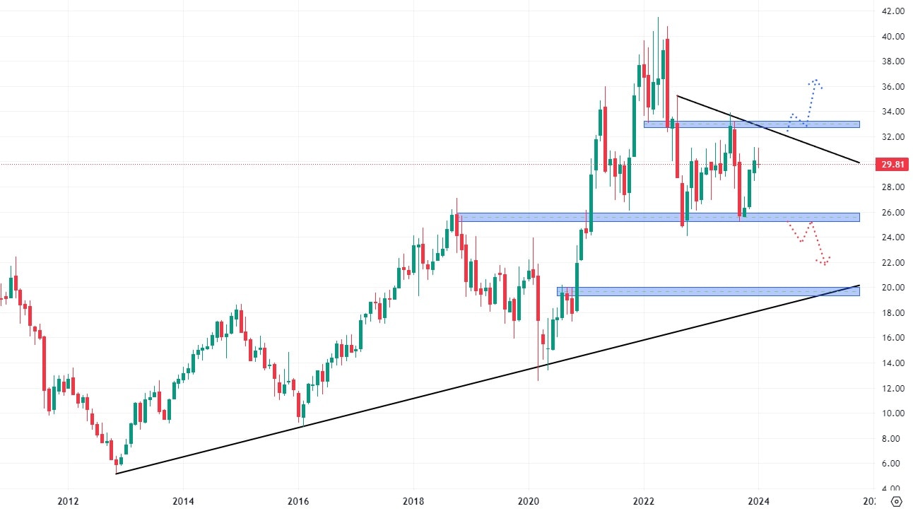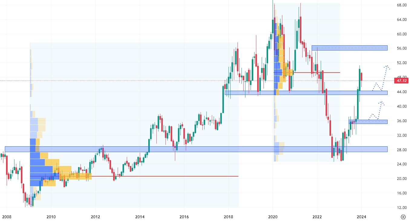 Akcie Intel v závěru loňského roku prorazily silnou rezistentní zónu, jejíž minimální ceny mohou nyní v trhu fungovat jako support. Zároveň byl akciový růst Intelu zastaven nejsilnějším volume. Trh může v současné době provést pullback směrem na hodnotu 44 USD a pokračovat v růstu. Pokud by akci klesly pod tuto hodnotu, může se jednat o výraznější cenový propad.