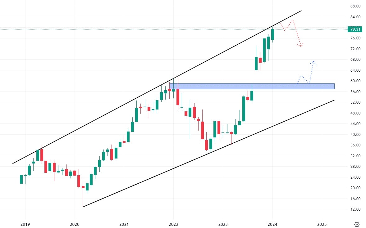 Akcie Dell se obchodují v rostoucím trendovém kanále a v současné době se nacházejí na horní hraně tohoto kanálu, což by mohlo predikovat oslabení. Nejbližší support se nachází na hodnotě fyzického gapu na ceně 60 USD za akcii. Pokud by tento výrazný support akcie v růstu nepodpořil, může dojít k odrazu od spodní hrany rostoucího kanálu. Průraz nad horní hranu kanálu by znamenal agresivní růst cenyakcií, nad rámec dlouhodobé konzistence.