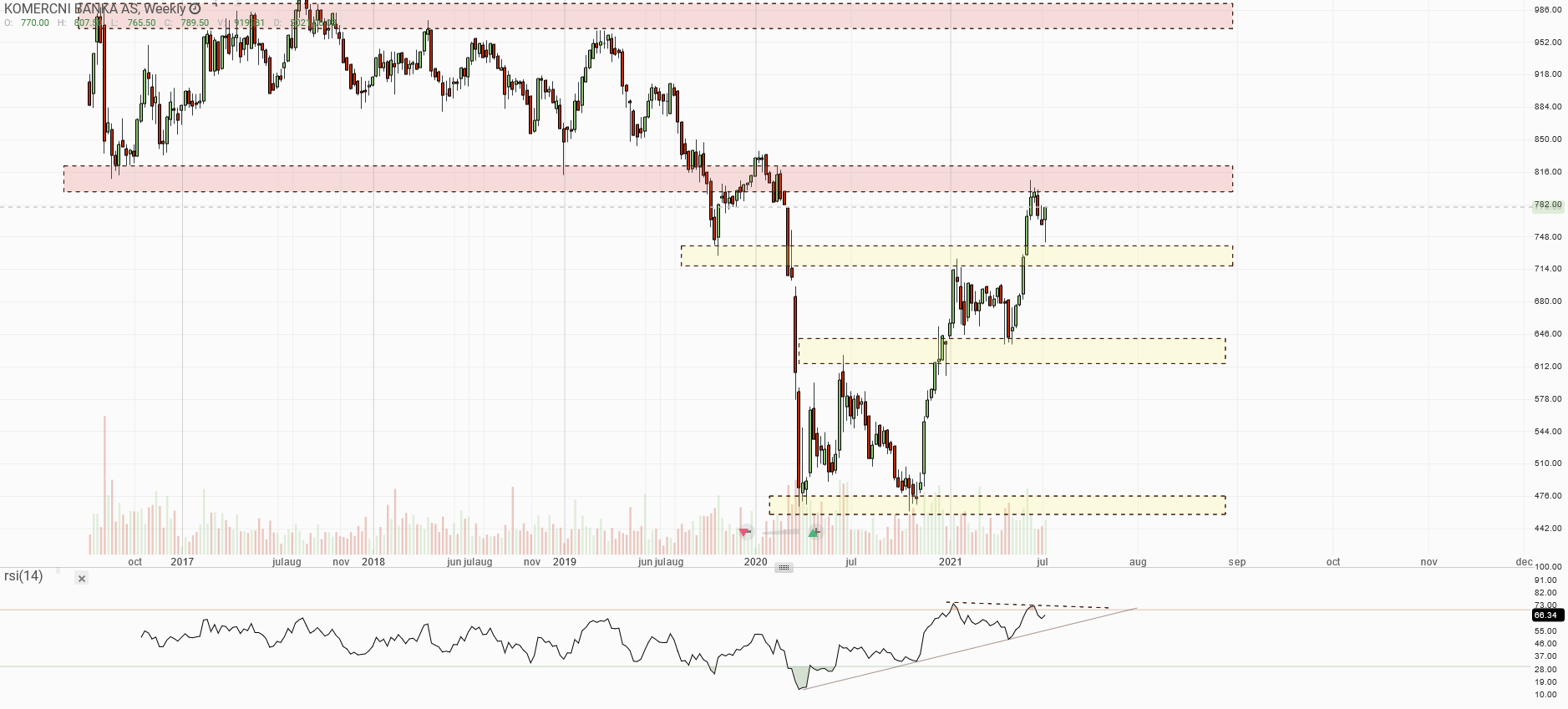 Abychom si zhodnotili historické price action, víme již z dubnové analýzy, že nakupující selhali u S/R levelu 729 korun. Trh v rozmezí S/R hladin 729 – 630 korun po mnoho týdnů konsolidoval a právě spodní hladinu býci využili pro odraz. Býci zde zkrátka nabrali síly, naakumulovalo se a mohlo se dál. Jak je z grafu vidno, kurz projel S/R hladinou 729 korun jako nůž máslem.
