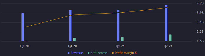Začneme prvně s kvartálními výsledky, které jsou výborné. Výnos za druhý kvartál letošního roku vzrostl o 9 % na 4,53 miliardy. Díky profit marginu 45,62 % je z toho však zisk o 2,07 miliardách USD (mezikvartálně zlepšení o 13 %). Tak vysoký profit margin je vážně dobrý, neboť i při poklesu výnosů si firma udrží relativně vysoký zisk.