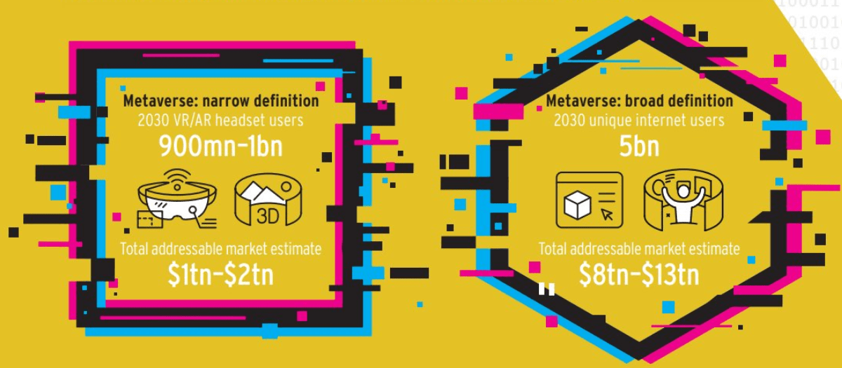 S poněkud pozitivnější analýzou přišla naopak banka Citibank, která ohodnotila TAM (total addressable market) metaverse až na 15 bilionů dolarů. Primárně by tržby měly plynout ze zařízení nutných k připojení a unikátních uživatelů virtuální reality.