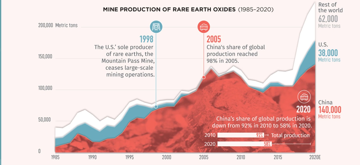 Pokud jste v odebírání tak strategicky důležitých materiálů závislí na Číně, je to zadání pro problém. Západní státy si to začaly uvědomovat po roce 2000, kdy Čína ovládla téměř 100 % trhu.