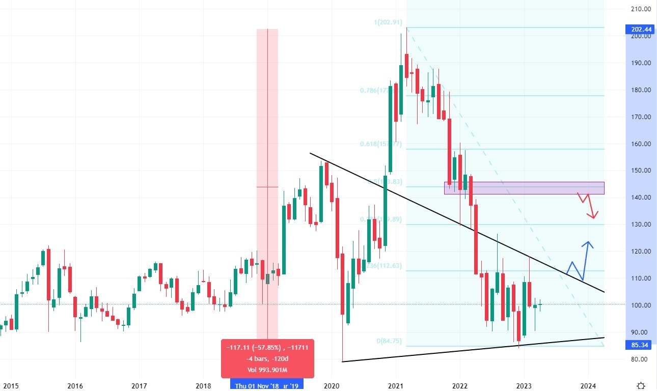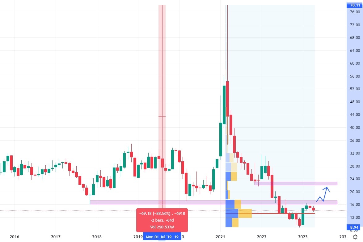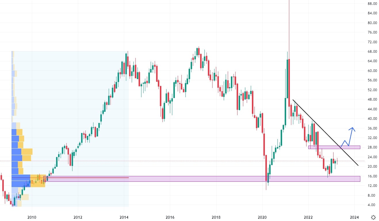 Výrazný cenový propad potkal akcie této velmi známé mediální společnosti. Od vrcholu v roce 2021 akcie Warner Brosztratily již více než 88,5 % své hodnoty a vypadá to, že nejbližší rezistence je pošle opět níže. Akcie se v současné době obchodují nad hodnotou nejsilnějšího volume, ovšem v cestě vzhůru jim stojí několik rezistencí, přičemž hned na první akcie reagují výprodejem.