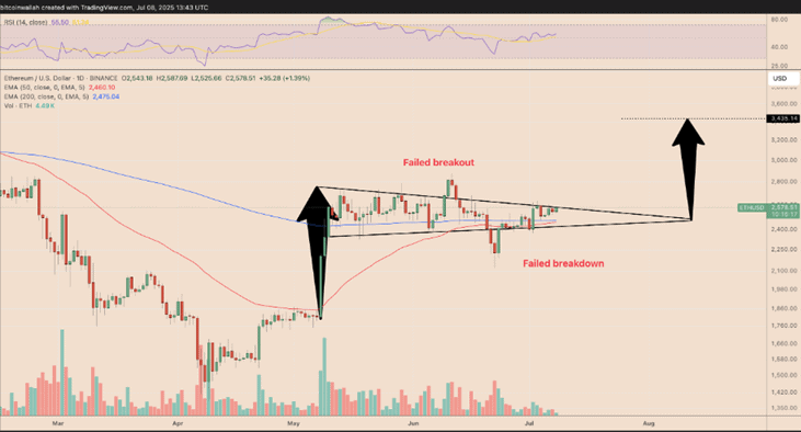 Proražení nad horní hranici obrazce by mohlo ETH do srpna posunout k úrovni 3 400 dolarů. Některé ukazatele dokonce naznačují, že by cena Etherea mohla do konce roku dosáhnout 5 000 dolarů.