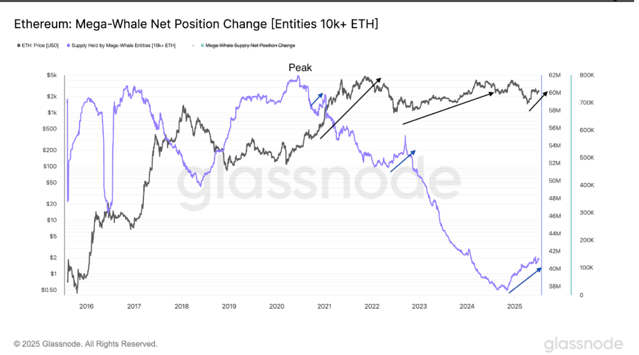 V poslední době peněženky držící alespoň 10 000 etherů začaly opět tuto kryptoměnu výrazně akumulovat. Data od společnosti Glassnode ukazují, že tyto mega velryby navýšily jimi držené množství o 9,31 %.
