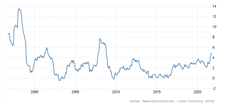 Nakonec se potvrzuje to, co mnozí očekávali. Meziroční inflace totiž za září vzrostla na 4,9 %. Rychlost růstu cen se tak začíná přibližovat k obdobím obou krizí z roku 2000 a 2008. Inflační cílování jsou 2 %, takže naměřená inflace tuto hodnotu vysoce překonává.