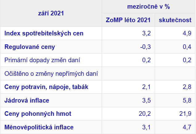 Přitom ještě letní prognóza ČNB kalkulovala s 3,2 %. Projekce tuzemské centrální banky se tudíž mýlila o 1,7 procentního bodu. Dle jejich zprávy se projekce zpracovávala během července a odchylka od prognózy byla patrná již v srpnu a v září se dále rozšířila.