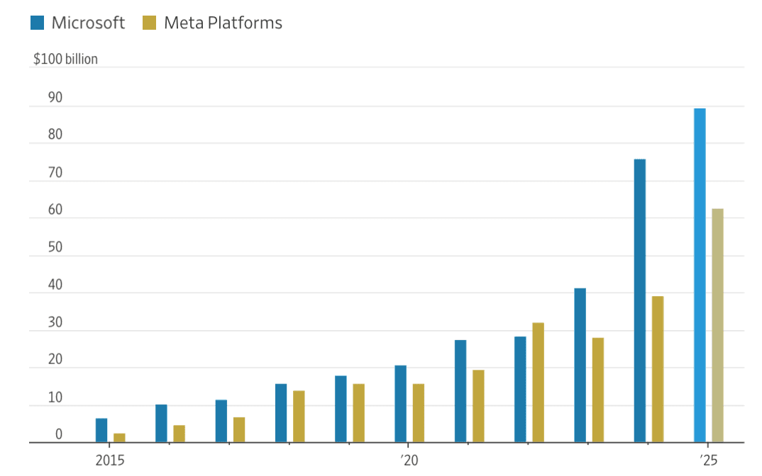 Microsoft a Meta jsou dvě velmi odlišné firmy, které mají jednu velkou věc společnou. Obě nyní vynakládají přibližně 30 % svých ročních příjmů na kapitálové výdaje, což je mnohem větší procento, než jaké vynakládají jejich konkurenti Amazon a mateřská společnost Google, Alphabet.