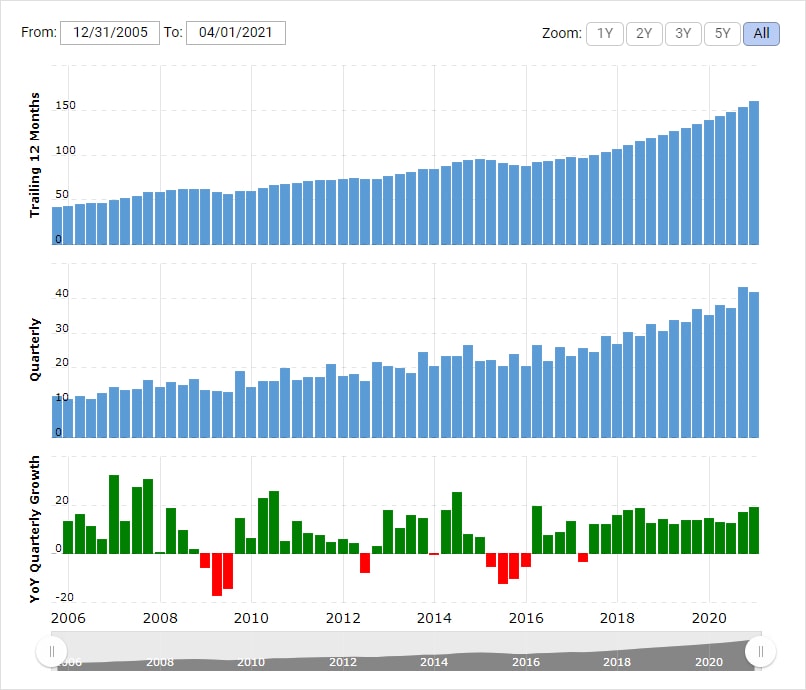 Vývoj celkových tržeb společnosti Microsoft od 31. 12. 2005 do 31. 3. 2021. Zdroj: macrotrends.net