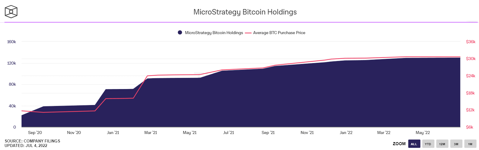 Dne 29. června 2022 společnost MicroStrategy oznámila, že v období od začátku května do konce června nakoupila přibližně 480 bitcoinů za 10 milionu dolarů v hotovosti při průměrné ceně přibližně 20 817 dolarů za bitcoin. Ke konci června 2022 tak společnost MicroStrategy drží 129 699 bitcoinů, které byly pořízeny za celkovou cenu přibližně 3,98 miliardy dolarů.
