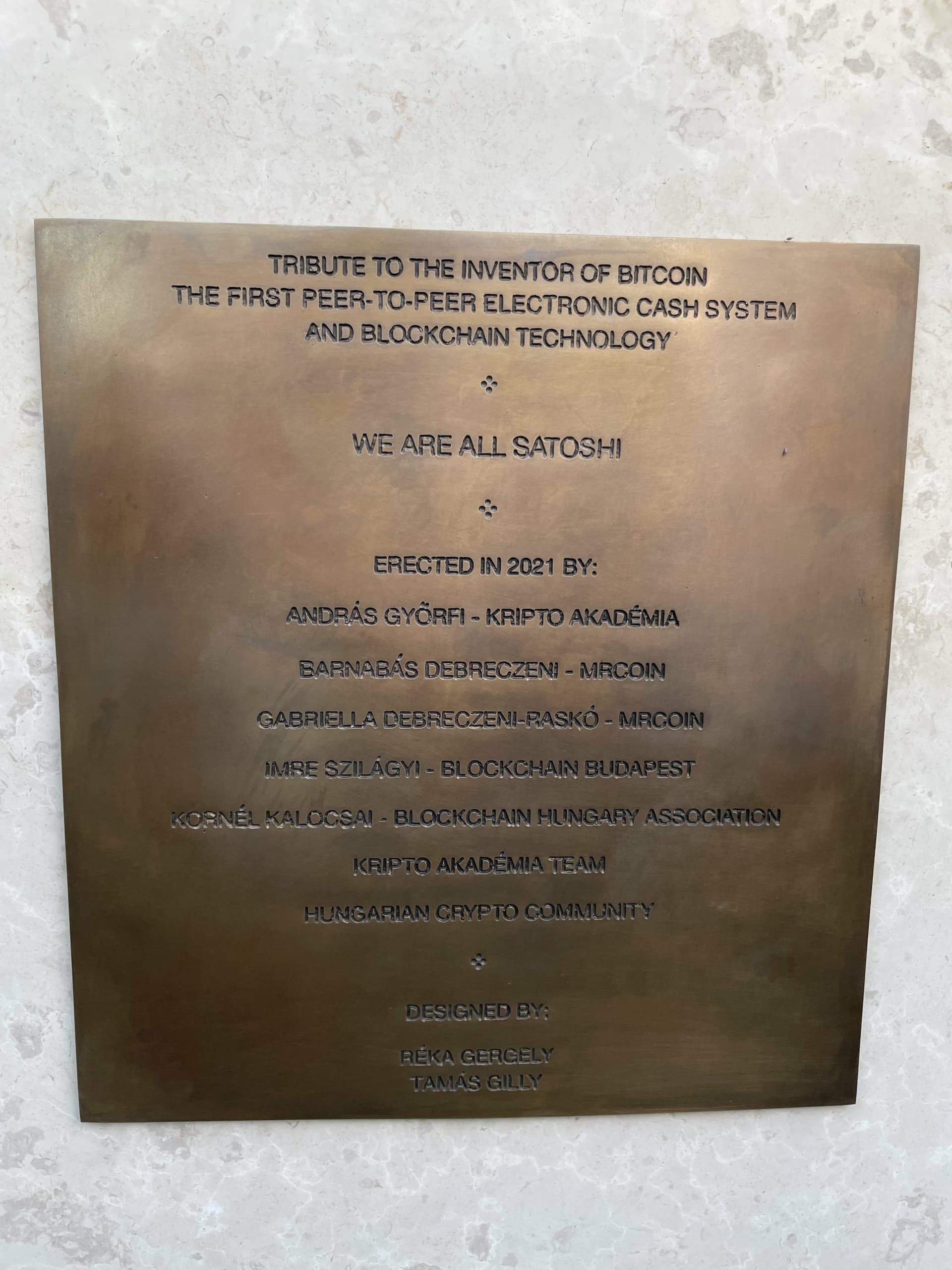 “Na počest vynálezce Bitcoinu, prvního peer-to-peer systému elektronických peněz a blockchain technologie,” stojí tam navždy vyryto.