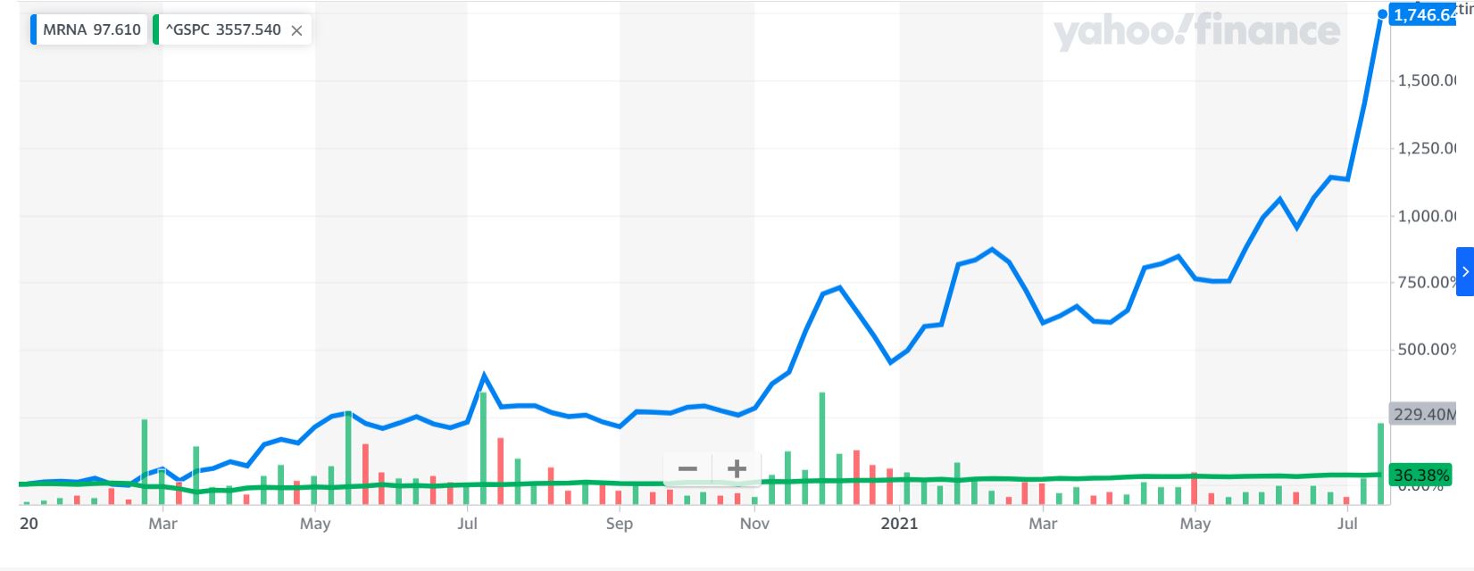 Srovnání růstu akcií Moderna a indexu S&P 500 od začátku roku 2020. Zdroj: finance.yahoo.com
