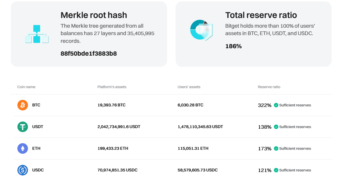 Bitget má také rezervy ve výši 186 % uživatelských aktiv, což zajišťuje, že prostředky uživatelů jsou plně kryté. Tyto rezervy jsou navíc pravidelně auditovány prostřednictvím firmy Merkle Tree.