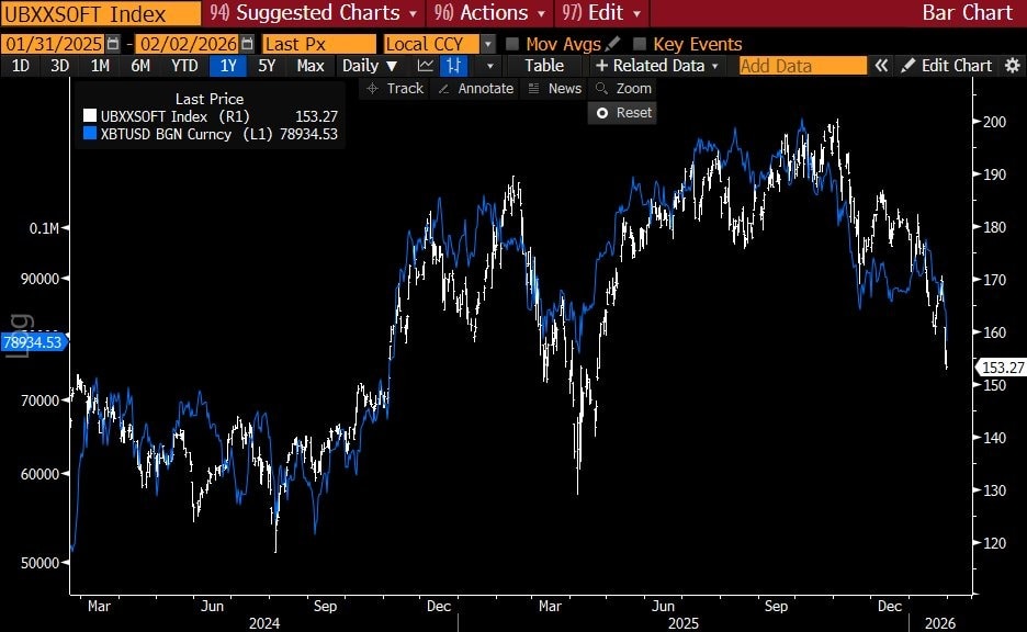 Na tento kontext upozorňuje i Raoul Pal, zakladatel Global Macro Investor, který dlouhodobě poukazuje na neúprosnou korelaci mezi cenovým vývojem Bitcoinu a sektorem SaaS akcií.