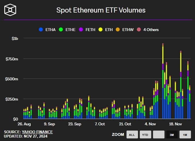 Probudily se i ethereové ETFs. Jejich zobchodovaný objem (volume) se v posledních dnech zvedl až 3x. I tak jsou však jejich hodnoty ve srovnání s bitcoinovými ETFs, které se staly nejúspěšnějšími novými ETFs v historii, stále zanedbatelné.