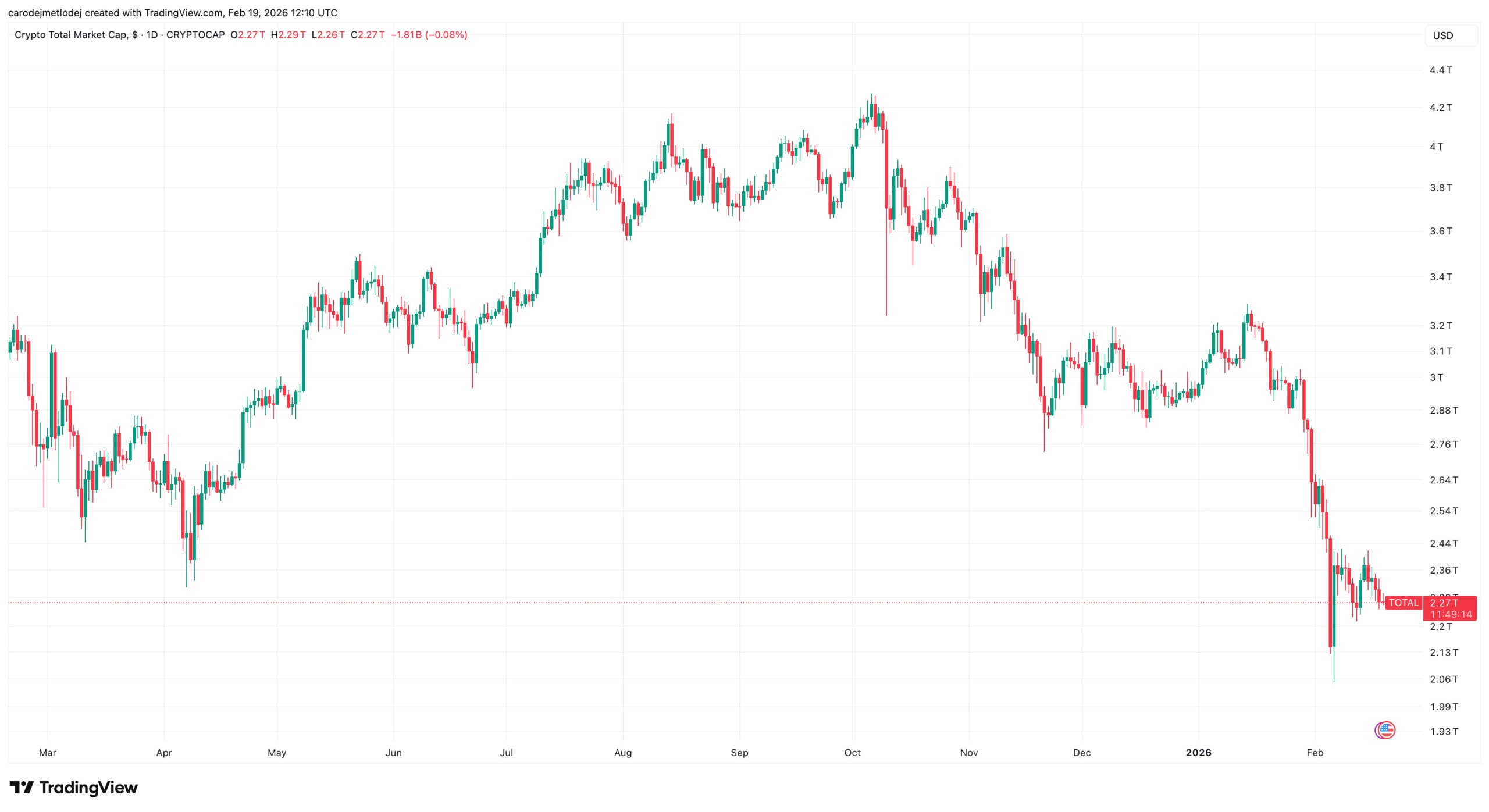 Za posledních 30 dní hodnota oslabila téměř o 40 procent v souvislosti s poklesem širšího kryptoměnového trhu, jehož tržní kapitalizace klesla na 2,4 bilionu dolarů.