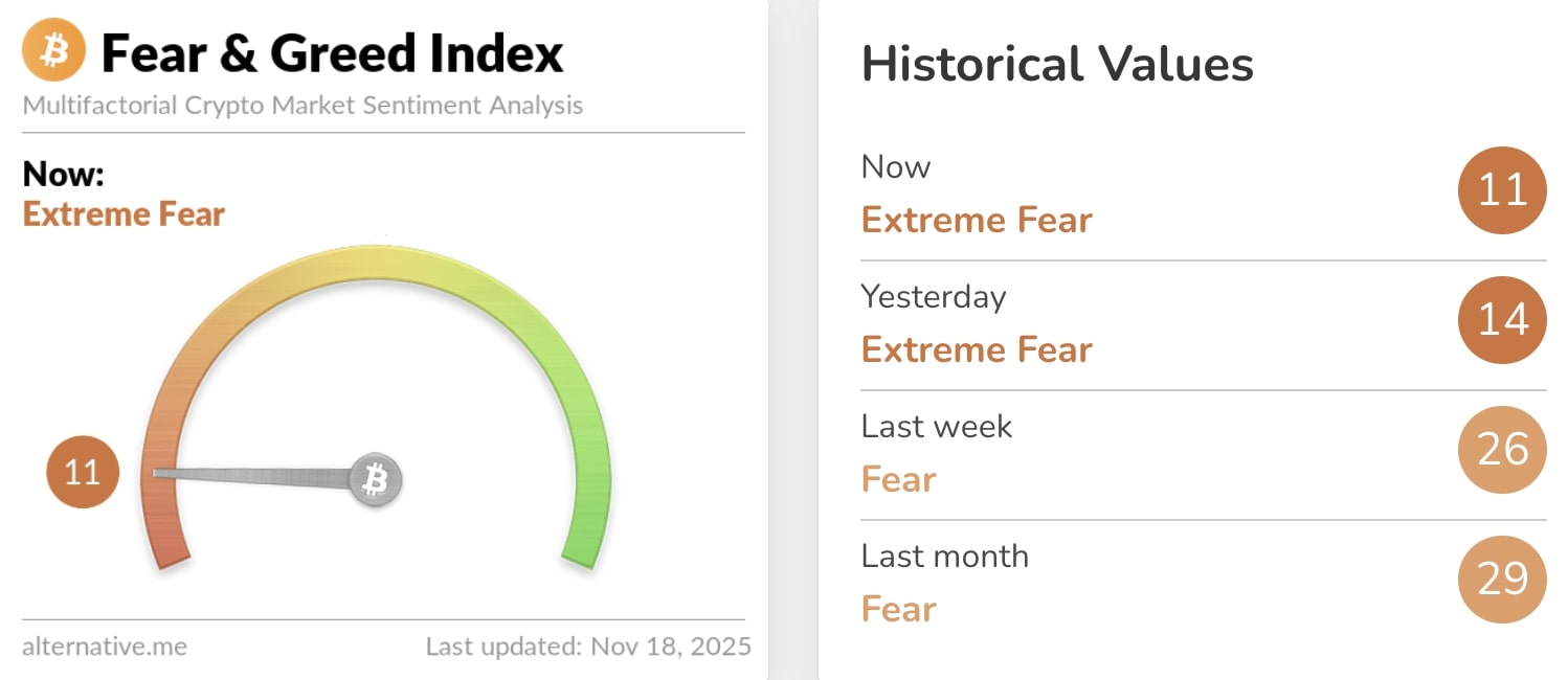 Retailoví investoři projevují stále silnější nervozitu. Index strachu a chamtivosti klesl na hodnotu 11, což odpovídá extrémnímu strachu a zároveň nejnižší úrovni od medvědího trhu v roce 2022.