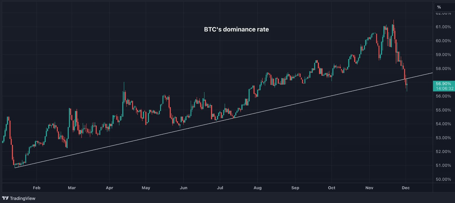 Hranice 100 tisíc USD Bitcoin (BTC) prozatím zastavila a ke slovu se tak konečně dostaly altcoiny. Bitcoinová dominance (tržní podíl BTC vůči ostatním kryptoměnám) spadla z 61 % až pod 57 % a prolomila rostoucí trend, který držela od začátku roku.