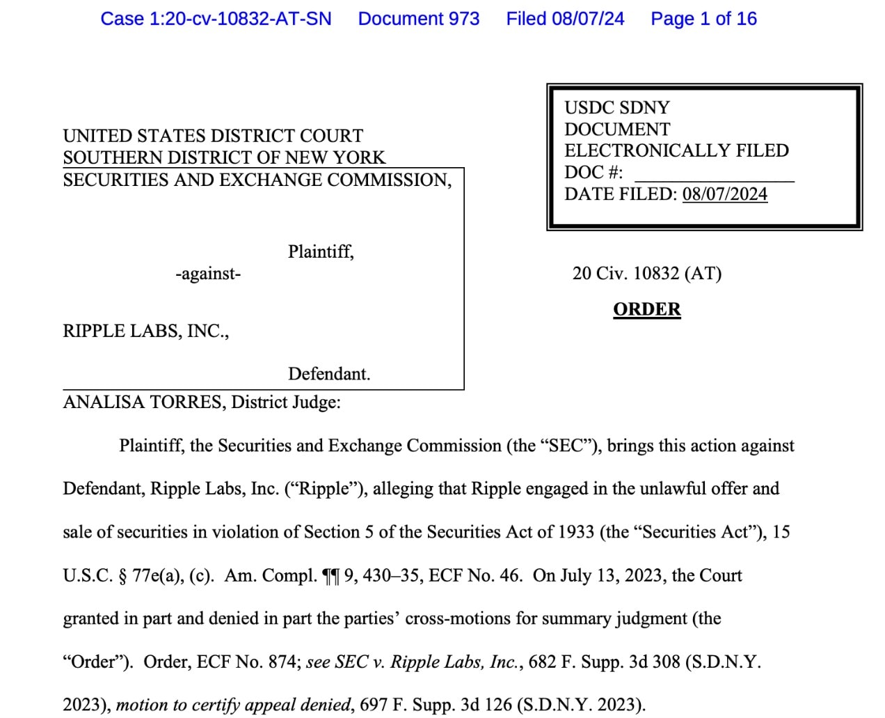 Newyorský soud rozhodl ve věci žaloby americké Komise pro cenné papíry (SEC) proti vydavateli kryptoměny XRP (XRP), společnosti Ripple Labs.