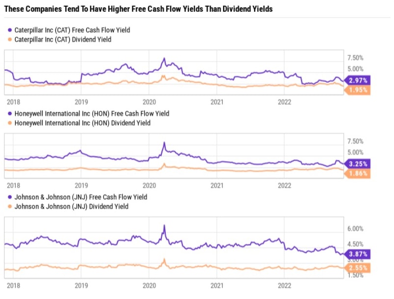 Například Caterpillar, Honeywell a Johnson & Johnson jsou součásti Dow, přičemž se jedná o přední společnosti v oboru, které trvale zvyšují dividendy a produkují více FCF, než je potřeba pro jejich dividendové závazky. Snadno si to ověříte tak, že se podíváte na vztah mezi výnosem FCF a dividendovým výnosem.