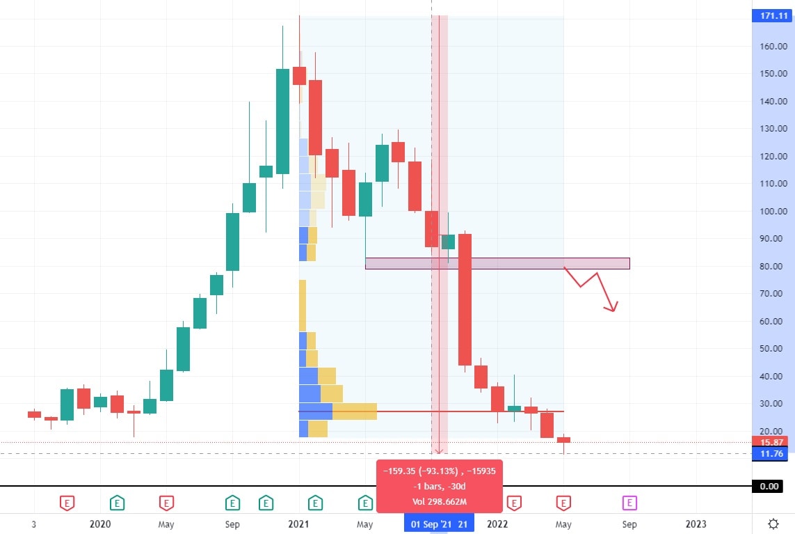 Akcie Peloton se obchodují ve ztrátě 93 % své původní hodnoty. Na cenovém grafu je patrná silná rezistence na cenové úrovni 80 USD, která by mohla tvořit významnou překážku v případě opětovného růstu. Tento instrument se obchoduje dokonce pod hodnotou svého IPO, které bylo na ceně 20 USD. I v tomto případě investoři, kteří drželi akcie příliš dlouho s největší pravděpodobností skončili ve vysoké ztrátě.