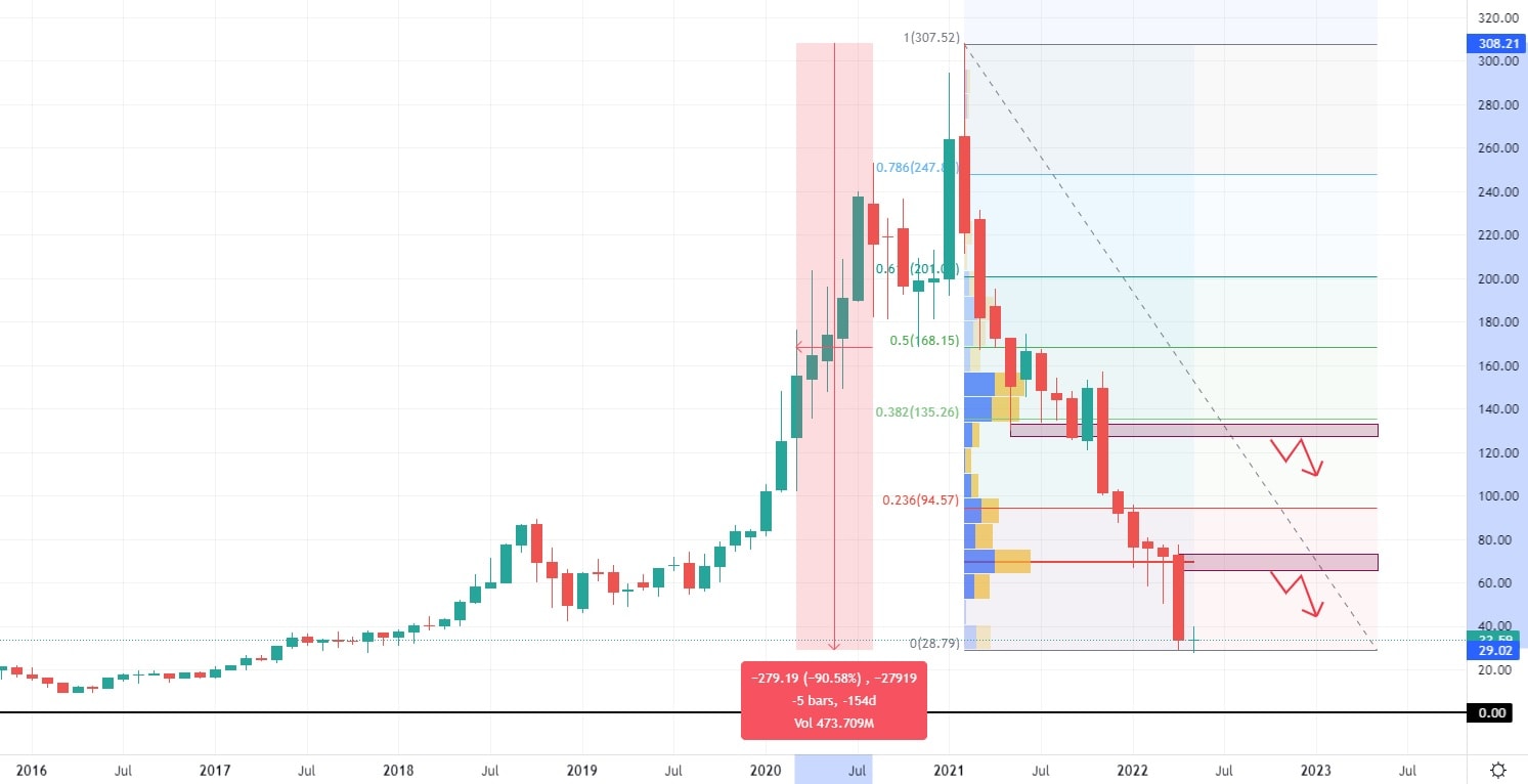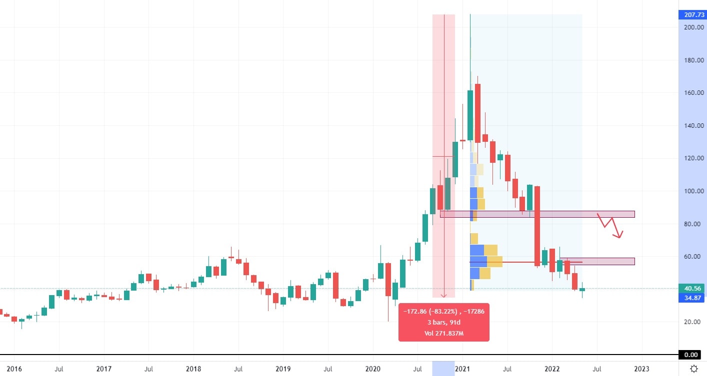 Společnost Zillow se specializuje na prodej a pronájem virtuálního reklamního prostoru pro trh s nemovitostmi. I přes naprosto odlišný tržní segment, byl akciový vývoj této společnosti totožný s Teladoc. Roční růst akcií, zakončený výraznou High, kde započala i výprodejová reakce, která do dnešních dní nebyla ještě ukončena. Společnost evidovala rekordní tržby v roce 2021, které dosáhly částky 8, 15 miliardy USD. V dřívějších letech se přitom tržby společnosti pohybovaly okolo 3 miliard dolarů.