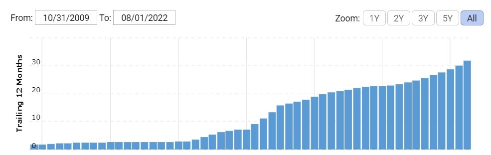 Při současné ceně akcií Broadcom je dividendový výnos solidních 3,3 %, ale nejpůsobivější je rychlý růst výplaty. V posledních třech letech se akcionářům každoročně zvyšovala v průměru o 18 %, což předstihuje i dnešní vysokou inflaci.