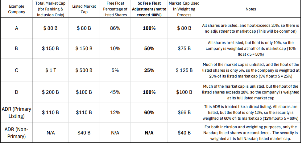 Jejich váha v indexu by se uměle upravila na pětinásobek reálného procenta volně obchodovaných akcií. Díky tomu by šlo do indexu zahrnout i obří firmy s malým podílem akcií na burze, aniž by to ohrozilo likviditu indexu.