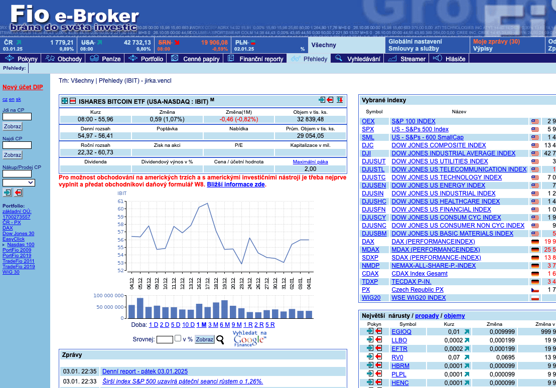 Tou první je Fio e-Broker. Jak vidíte, prostředí se sice zastavilo v devadesátkách, ale nabídka je exkluzivní. Druhou možnost, kde nakupovat americká ETF, a tedy i ta bitcoinová mi nabízí Birdwingo.