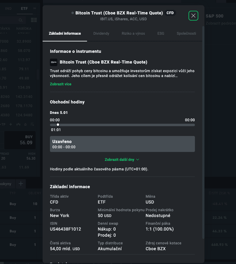 Vím, že sice XTB pravé americké ETF nenabízí, ale zkusil jsem vyhledat IBIT a našel jsem. Ovšem pozor, nejedná se o ETF, ale o CFD.