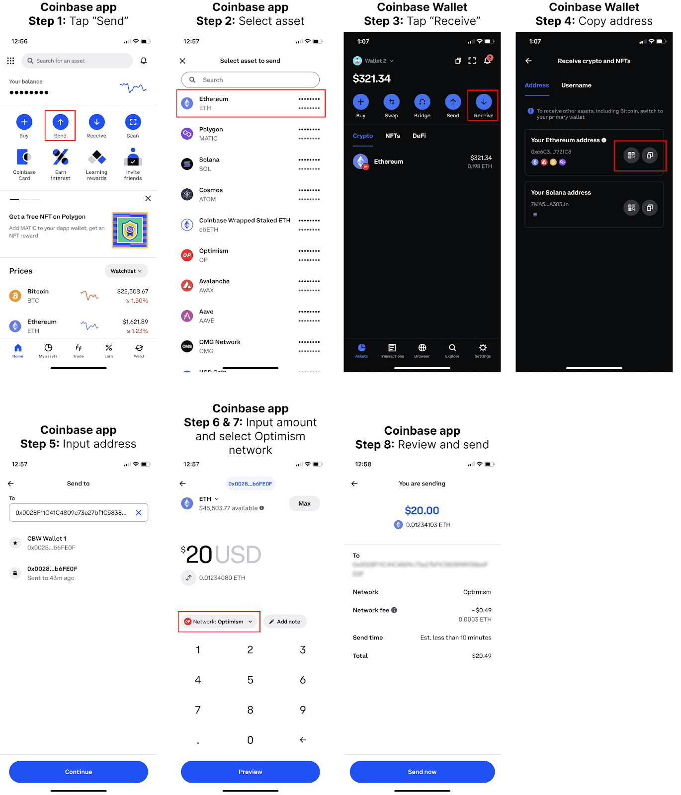Níže na obrázku je návod přímo od Coinbase.Je důležité, aby ethery byly na síti Optimism! (viz krok 6 a 7). Pokud máte ethery na Coinbase burze, na adresu na Optimism je také můžete snadno vybrat, viz návod níže.