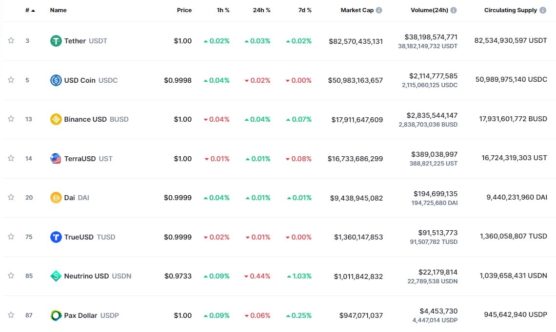 Poznámka: Algoritmické stablecoiny nejsou kryty skutečnými dolary v poměru 1:1, ale udržují svoji hodnotu přesně na 1 dolaru díky motivaci uživatelů k arbitrážnímu obchodování stablecoinu pomocí nativní kryptoměny blockchainu (LUNA, WAVES).