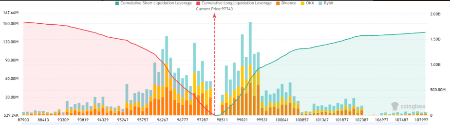 Data společnosti CoinGlass ukazují, že by pokles pod 95 000 dolarů vedl k likvidaci long pozic s pákovým efektem v hodnotě více než 1,52 miliardy dolarů napříč kryptoměnovými burzami.