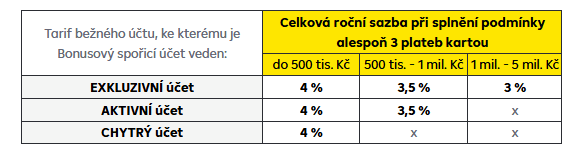 Výše bonusového úroku se pak odvíjí podle velikosti vkladu a od toho, jaký máte sjednaný běžný účet. Základní sazba při nesplnění aktivity činí 0,1 % p.a. do výše zůstatku: u Chytrého účtu do výše 500 tisíc Kč, Aktivního účtu do výše 1 milion Kč a Exkluzivního účtu do výše 5 milionu Kč.