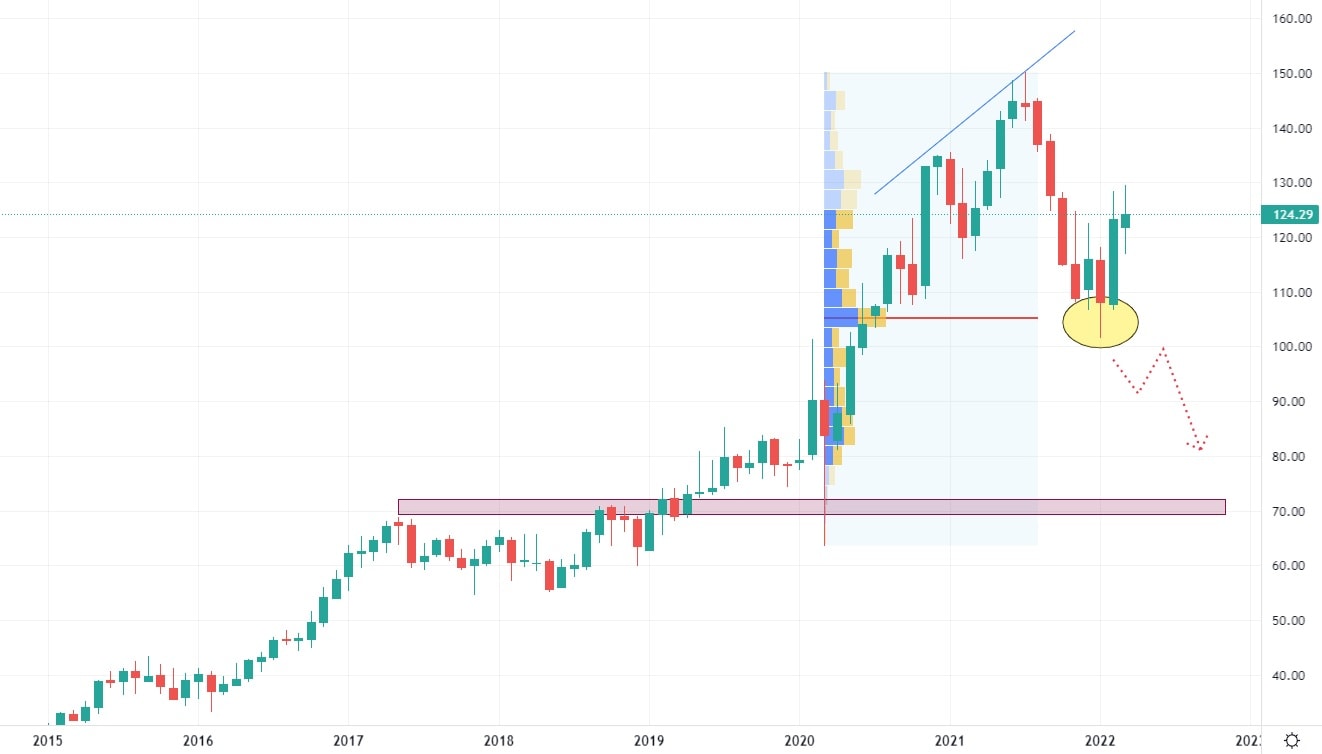 Ani akcie T-Mobile se nevyhnuly novoročnímu propadu technologických společností, při kterém odepsaly téměř 33 % své hodnoty. V rámci tohoto výprodeje se pokles zastavil na silné Volume oblasti, který se nacházela na ceně 105 USD za akcii. Po krátké konsolidaci se trh vydal směrem vzhůru a během posledních dvou měsíců vykázal růst 21,5 %. V současném tržním nastavení se na akciovém grafu společnosti T-Mobile nenachází žádná zásadní rezistentní zóna, která by bránila akciovému růstu této společnosti.