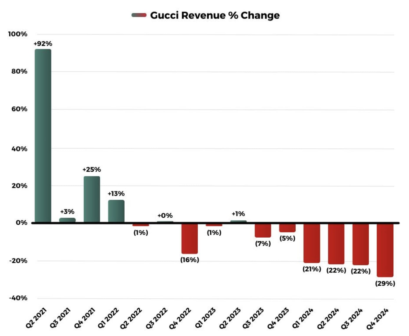 Gucci čelí silné konkurenci ze strany značek jako Hermès, Louis Vuitton nebo Chanel, které nadále prosperují. Zákazníci totiž hledají nejen luxusní, ale také jedinečné a exkluzivní produkty, které budou hodnotově stabilní a dlouhodobě atraktivní.