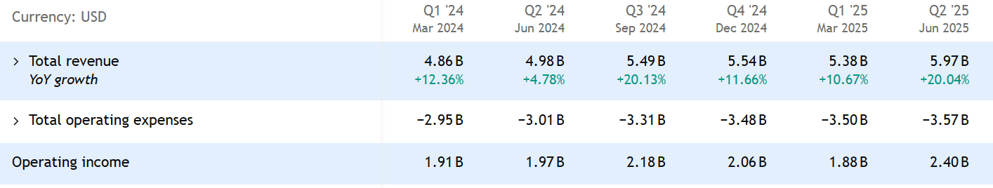 V Q2 2025 tržby společnosti vzrostly o 20 % a dosáhly 5,97 miliardy USD. Čistý zisk se zvýšil o 7 % na 1,59 miliardy USD.