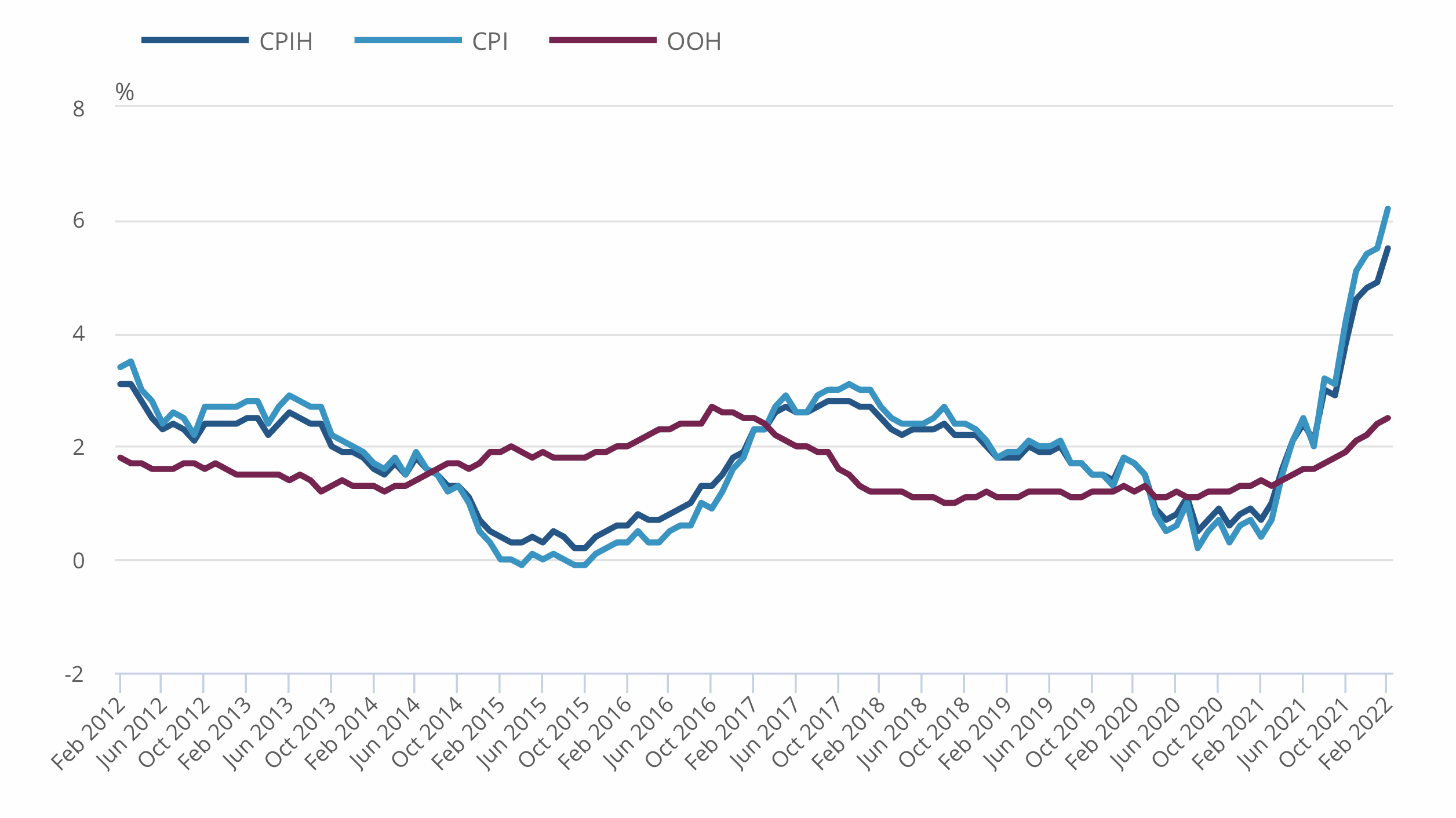 Inflace dosáhla nového 30letého maxima 6,2 %. Britský statistický úřad (ONS) uvedl, že inflace ve Velké Británii v únoru stoupla na 6,2 %(CPI na grafu níže) v meziročním srovnání, což je nejvýše od března 1992. Trh počítal s růstem z lednových 5,5 % pouze směrem k 5,9 %.