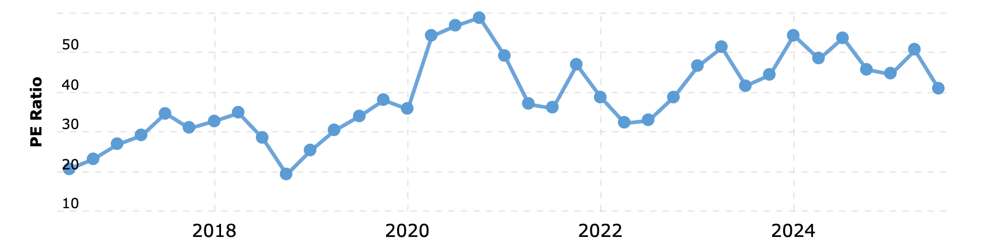Ferrari se obchoduje za násobky, které bývají vyhrazeny technologickým lídrům: P/E poměr se dlouhodobě pohybuje v pásmu 40 až 50 bodů.