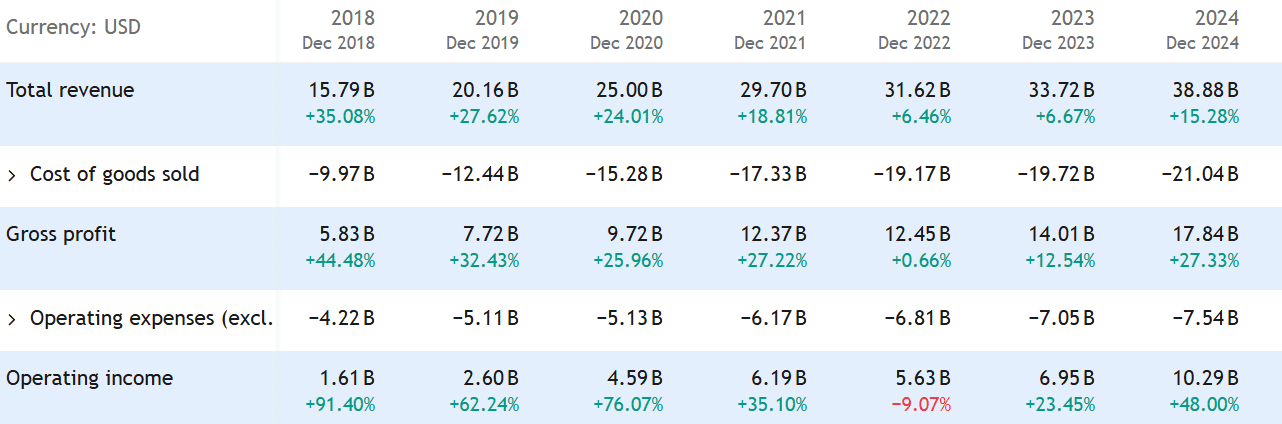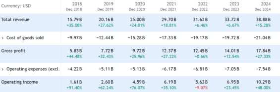 Za celý rok 2024 společnost vytvořila tržby 38,9 miliard dolarů, což bylo o 15 % více než v předchozím roce.